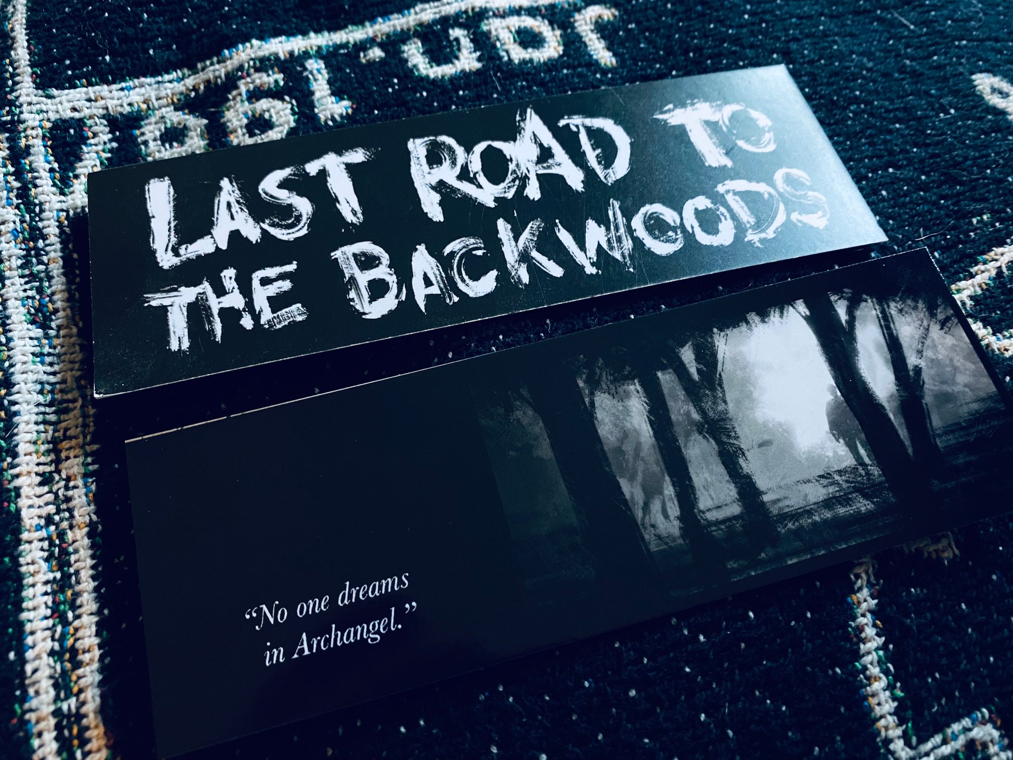 A Last Road to the Backwoods bookmark, featuring the striking cover art by Matt Soffe